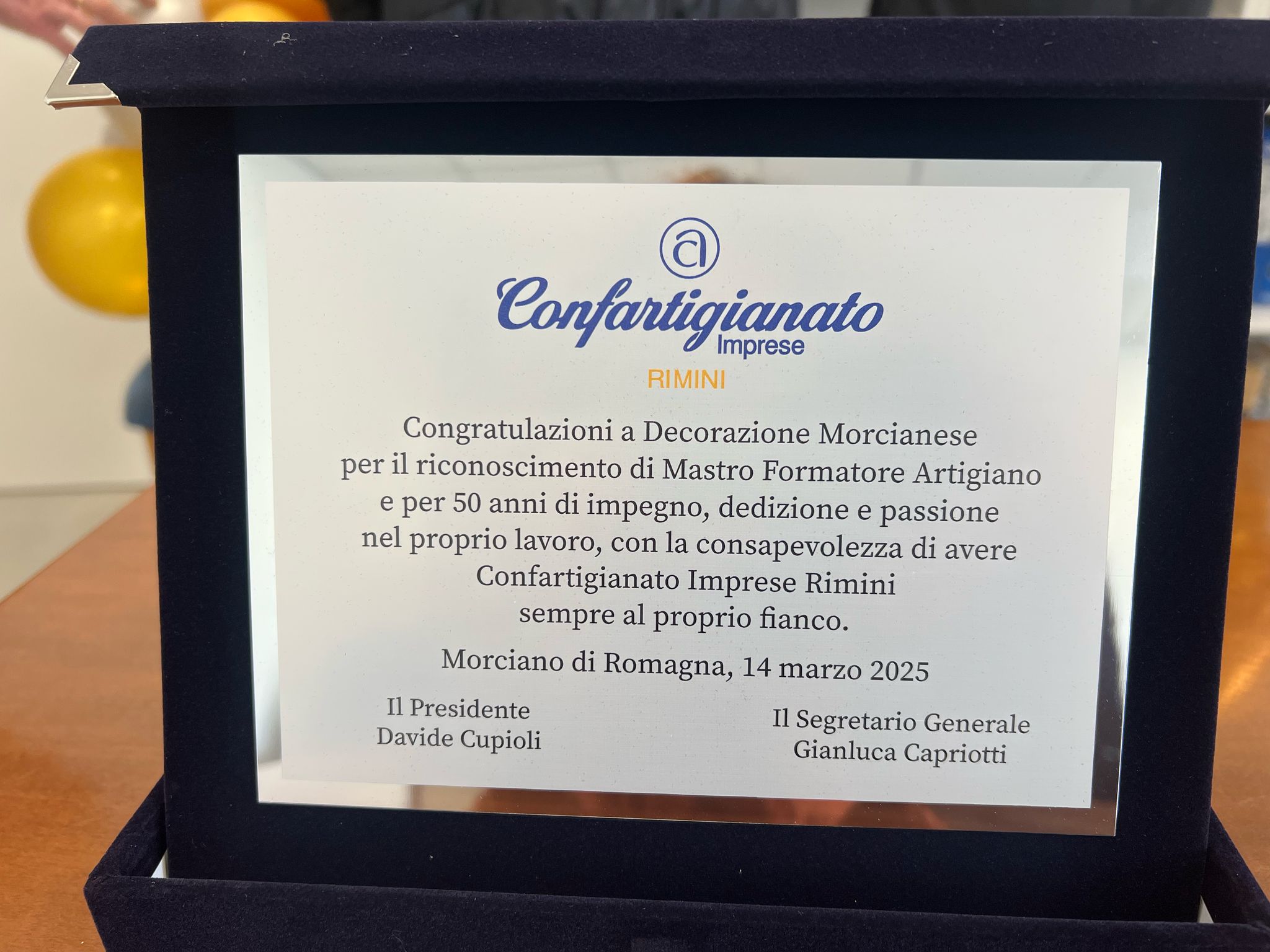 In occasione del conferimento dell’attestato di Mastro Formatore, Confartigianato ha consegnato a Decorazione Morcianese anche una targa commemorativa.