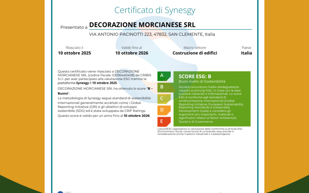 Il certificato è stato rilasciato da CRIBIS S.r.l. tramite la piattaforma digitale Synesgy, basata su standard internazionali come i Global Reporting Initiative (GRI) e i Sustainable Development Goals (SDG). Lo score B – Buono è valido fino al 10 ottobre 2026 e conferma che Decorazione Morcianese opera con un buon livello di adeguatezza rispetto ai principi ESG.